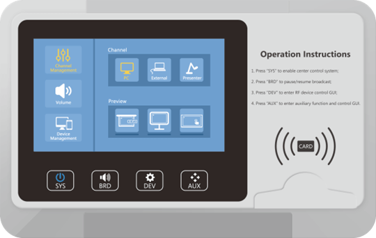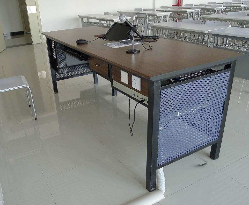 教师桌上设有桌面触控面板,让教师以人性化的界面控制整个教室的所有AV技术。只需按下一个按钮,就可以轻松切换多个AV信号源,并为显示器和灯(IQSchool Power & a /C Control Terminal)供电,调节教室扬声器的音量。为防止教师喉咙疼痛,为教师提供免提无线麦克风(IQ 2.4G无线麦克风),可戴在脖子上或别在翻领上。